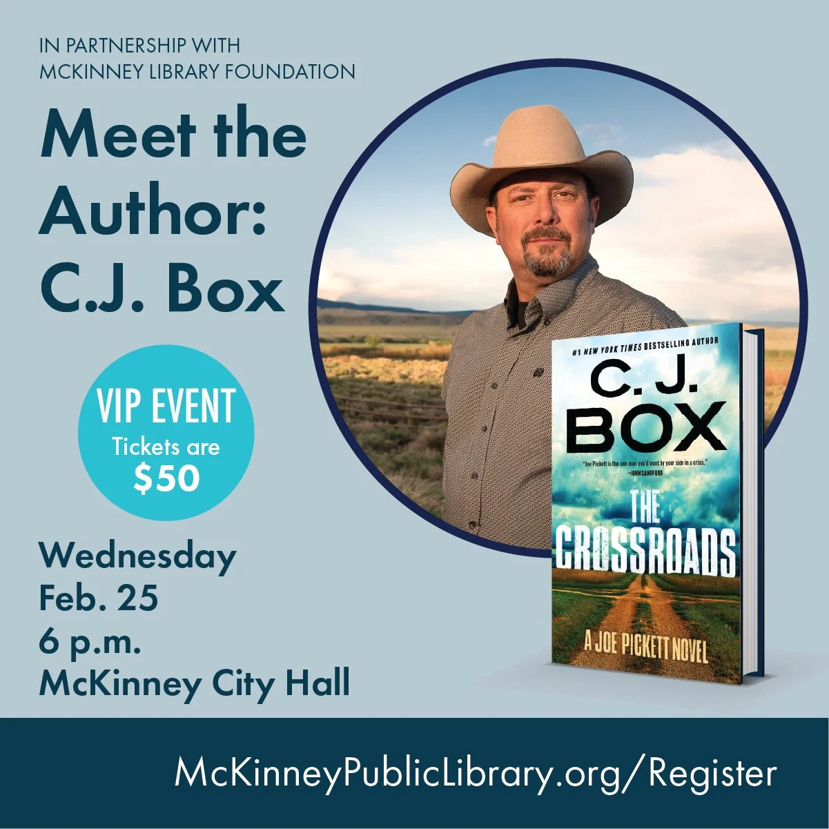 Please join us at McKinney City Hall to meet award-winning, #1 New York Times bestselling author C.J. Box. C.J. will discuss his writing and his latest book. The Crossroads is a gripping, family-centered mystery for both loyal fans and newcomers. Readers love Joe Pickett—a likeable, dogged hero who always tries to do the right thing—and this time, his three daughters share the spotlight. Set against the fierce beauty of the modern West, where energy empires, cartels, and powerful families vie for control of the land, Box delivers a timely, emotionally charged thriller about family, loyalty, and the cost of standing for what’s right in a world where corruption runs deep."